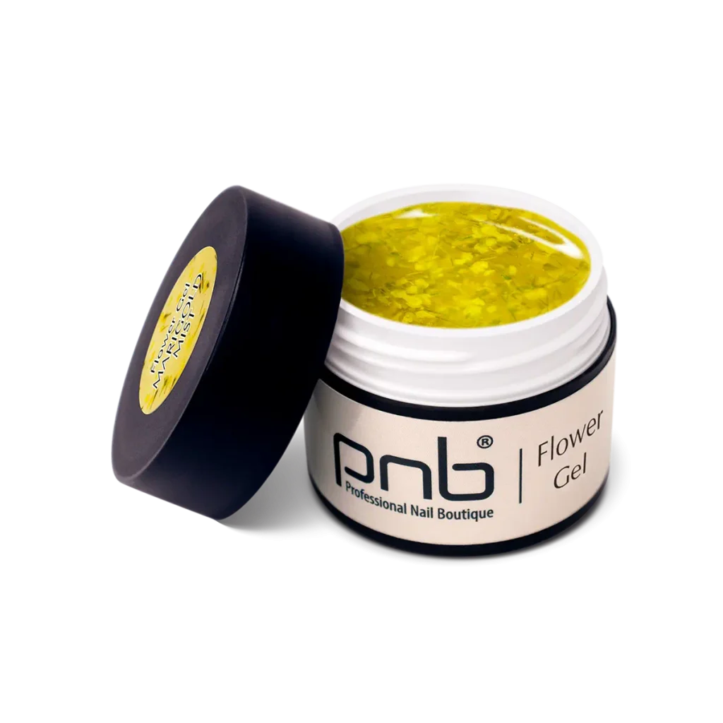 Flower Gel PNB - Marigold Mist je univerzalni barvni prosojni modelirni gel z vključenimi posušenimi cvetovi.